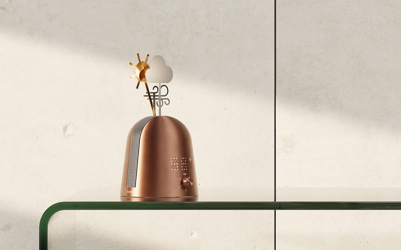 El dispositivo de metal con luz solar, nubes y símbolos de gota de lluvia en la parte superior se encuentra en una mesa redonda blanca, apoyada contra un fondo gris puro.