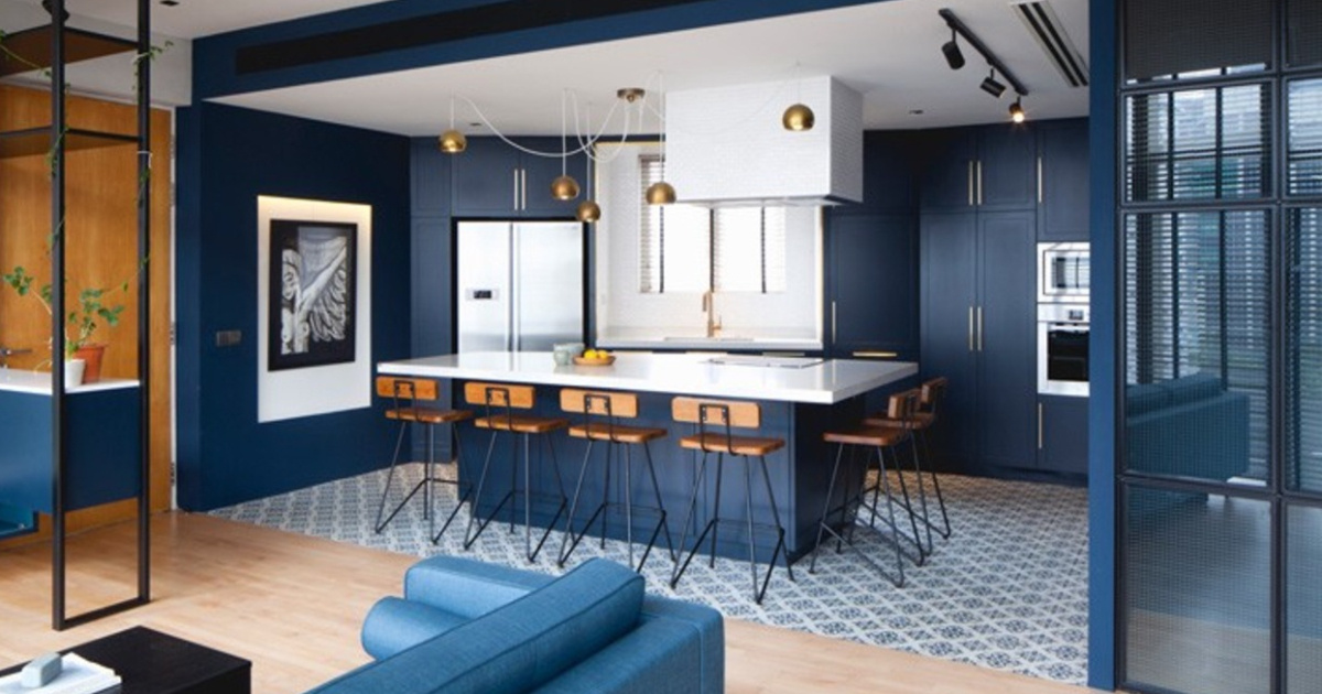 La cocina está completamente absorbida en la caja azul. Las paredes, los gabinetes e incluso los techos están pintados con el mismo cobalto saturado, creando un entorno unificado e inmersivo. El azul continúa a lo largo de los gabinetes inclinados y a lo largo de las fachadas inclinadas, mientras que las encimeras blancas y los pisos de azulejos estampados proporcionan el momento de alivio.