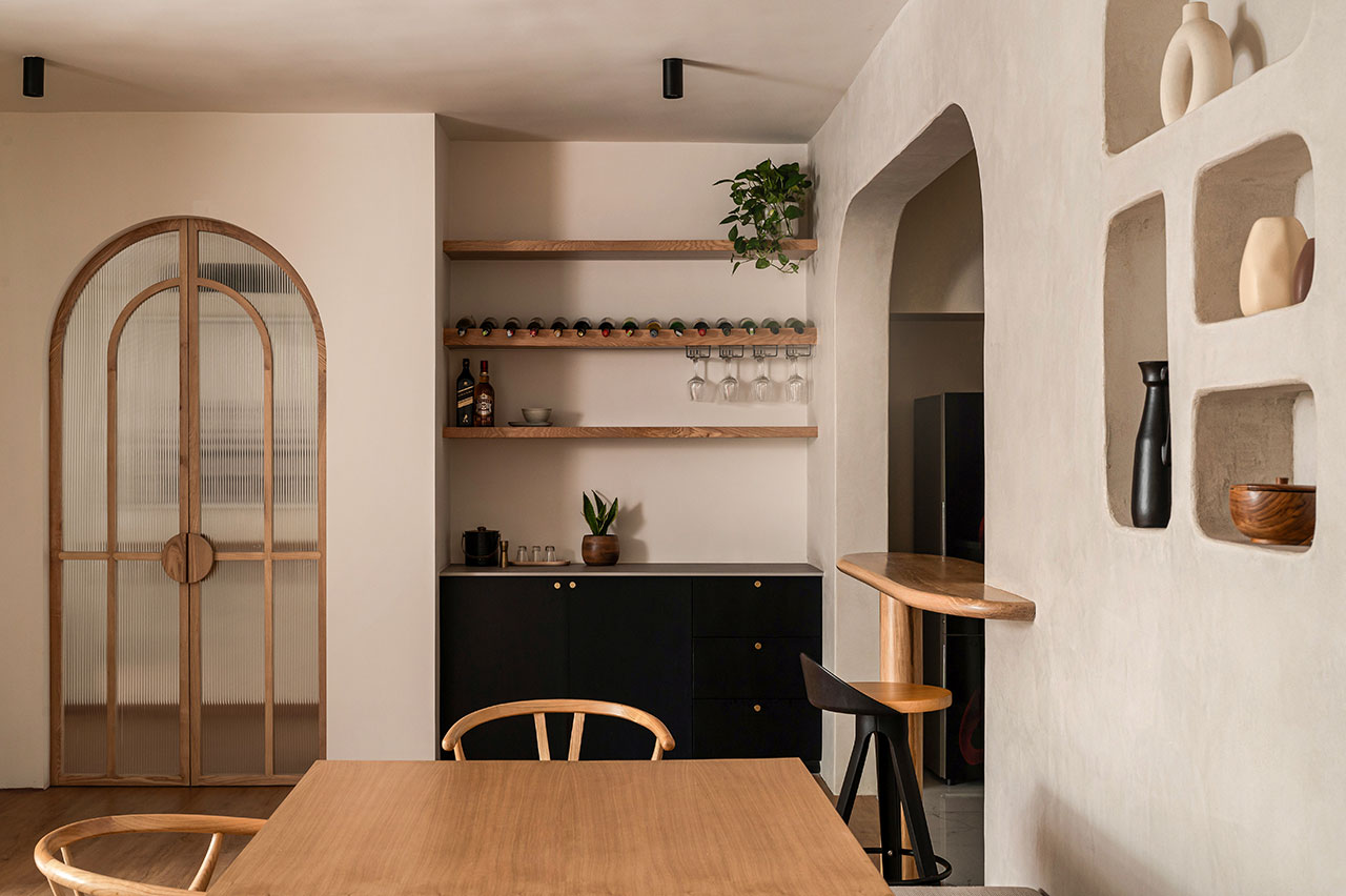 Al ingresar a la casa, los invitados son bienvenidos por la entrada arqueada con espejos en formas orgánicas, que son pistas del resto del apartamento. Estas curvas suaves aparecen a lo largo del proceso, haciendo que la habitación pase y mejore la estética escultórica de la casa.