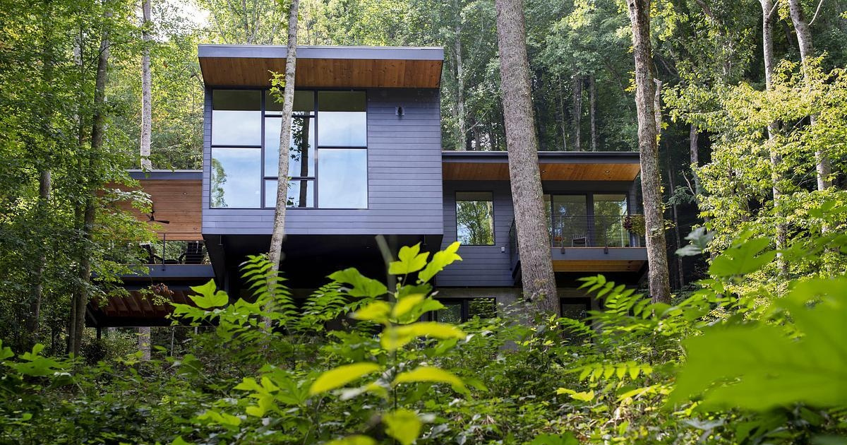 Una casa tranquila y compacta ubicada en los bosques de Carolina del Norte, diseñada para mezclarse con el bosque y disfrutar de las vistas del valle. La arquitectura reflexiva se ajusta a la belleza natural.