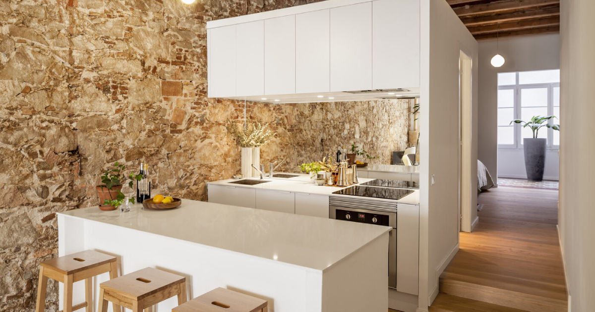 Los muros de piedra rústicos se encuentran con un minimalismo elegante en este apartamento