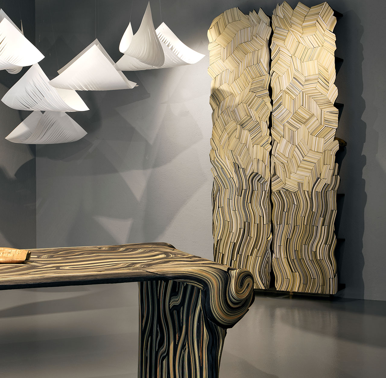 El papel se desarrolló por primera vez hace miles de años y continúa abriendo nuevas puertas para diseñar, una variedad de posibilidades. Fragmentos,Depender de Daniele Papuli existir Galería Dilmos para Semana del diseño de Milána través del camino de los materiales antiguos trenzados por los antiguos, seleccionó cuidadosamente su peso y película transparente. El color y los espesores variables se superponen entre sí, subvirtiendo el concepto estándar de la materia. Algunos están dispuestos en sus composiciones, persistiendo como madera o piedra, mientras que otros, sábanas de papel, vuelan sobre el cielo con brillo aireado. La exposición incluye tablas, cuencas de lavado, estanterías, consolas de juegos, etc., que cubren el exterior del papel en el formulario. El artista solo comenta sobre el poder y la durabilidad de los materiales antiguos y exponencialmente sobre los números, tal vez una metáfora de la humanidad.