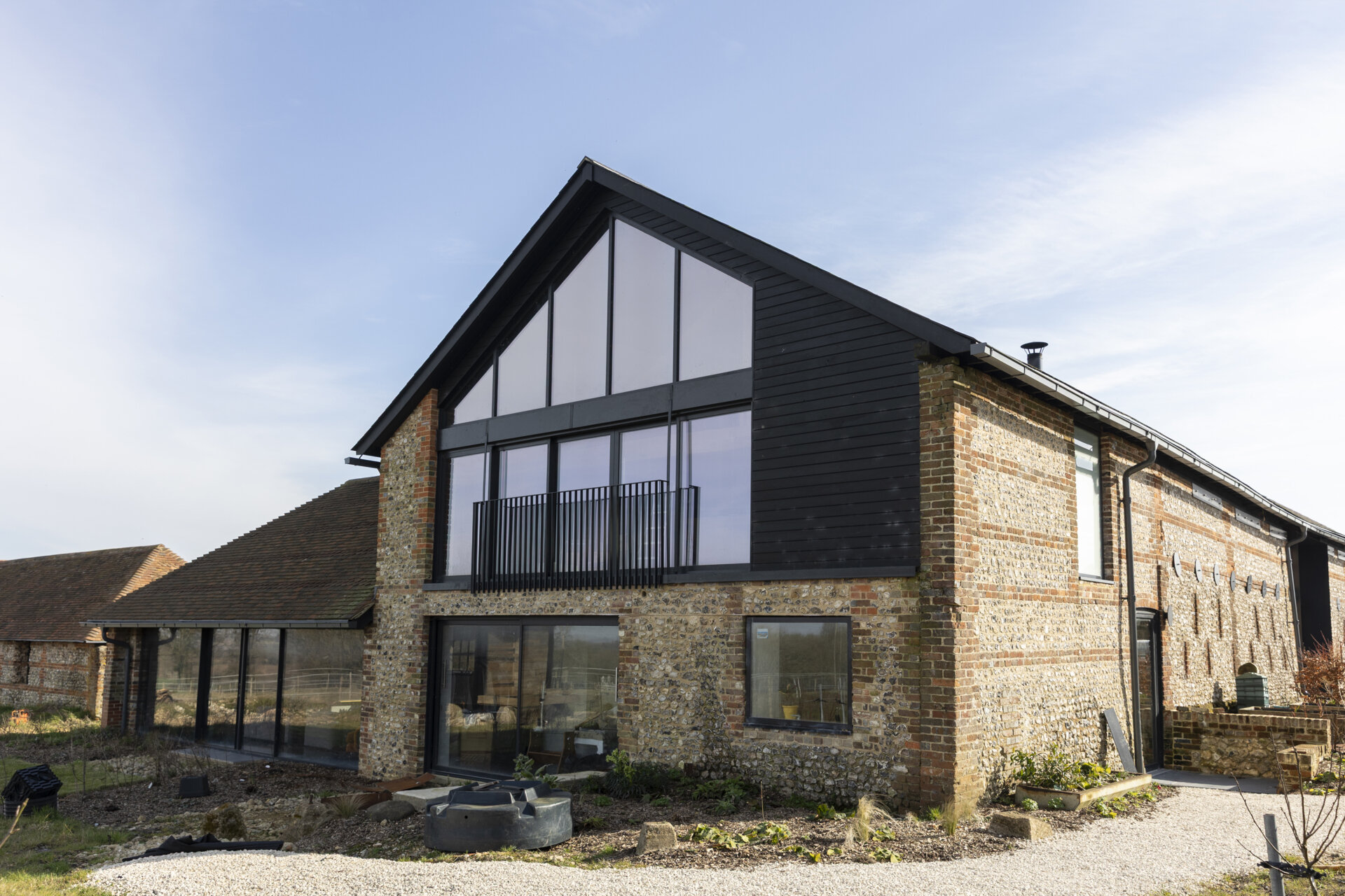 Foxhole Barns se encuentra en casi dos acres de campo de Hampshire AR Design Studio. Una vez que una granja láctea colapsada, la estructura se ha reconcierto como un cálido retiro moderno para conmemorar sus raíces agrícolas. Los clientes que dejaron su empresa para vivir persiguen un sueño a largo plazo, y participan profundamente en la transformación, limpian el sitio web ellos mismos y administran la construcción con el equipo de diseño.