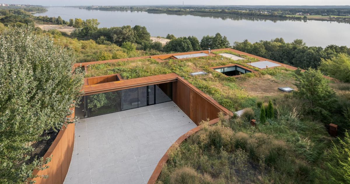 diseño 77 estudio«House on the Slope» es una casa unifamiliar en silencio incrustada en el terraplén a lo largo del río Vista en Polonia. Con su forma hundida, la fachada de acero Corten y el techo verde, el hogar conserva el terreno natural y prioriza la privacidad, la tranquilidad y las vistas mientras mantiene un impacto visual mínimo en los alrededores.