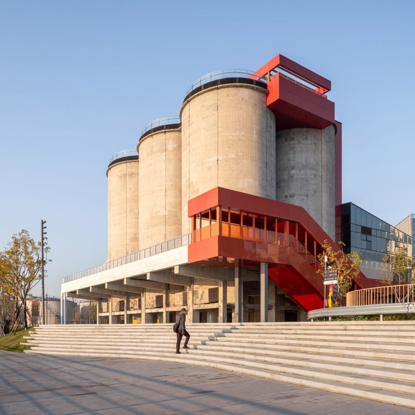 Ubicado en el río Huangpu, MVDV Para hacer concreto existente Silo La antigua planta de cemento es el foco principal, que celebra la reutilización del edificio y la historia del sitio.