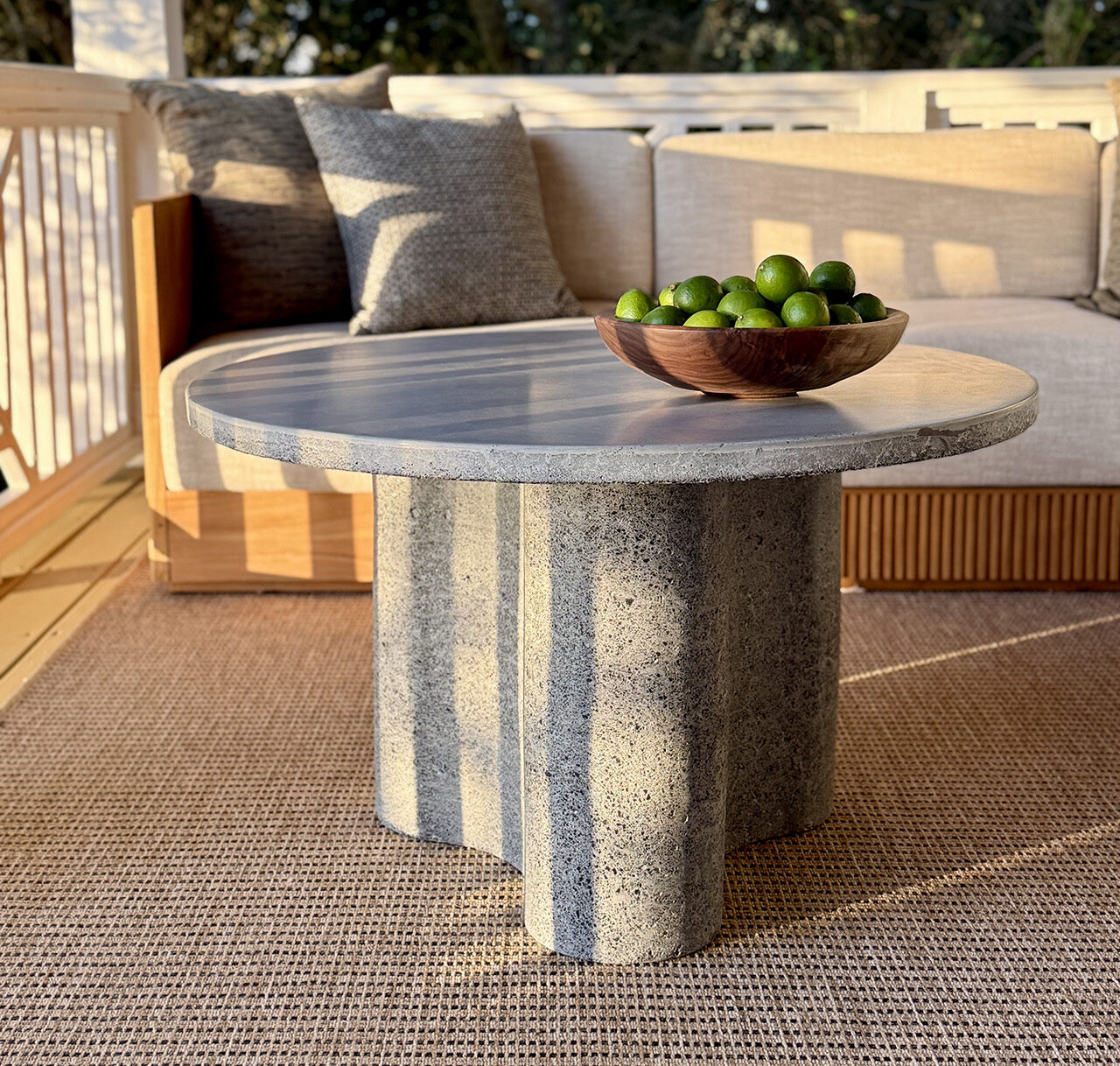 Un recipiente de madera lleno de lima se encuentra en una mesa redonda de concreto al lado de un sofá beige.