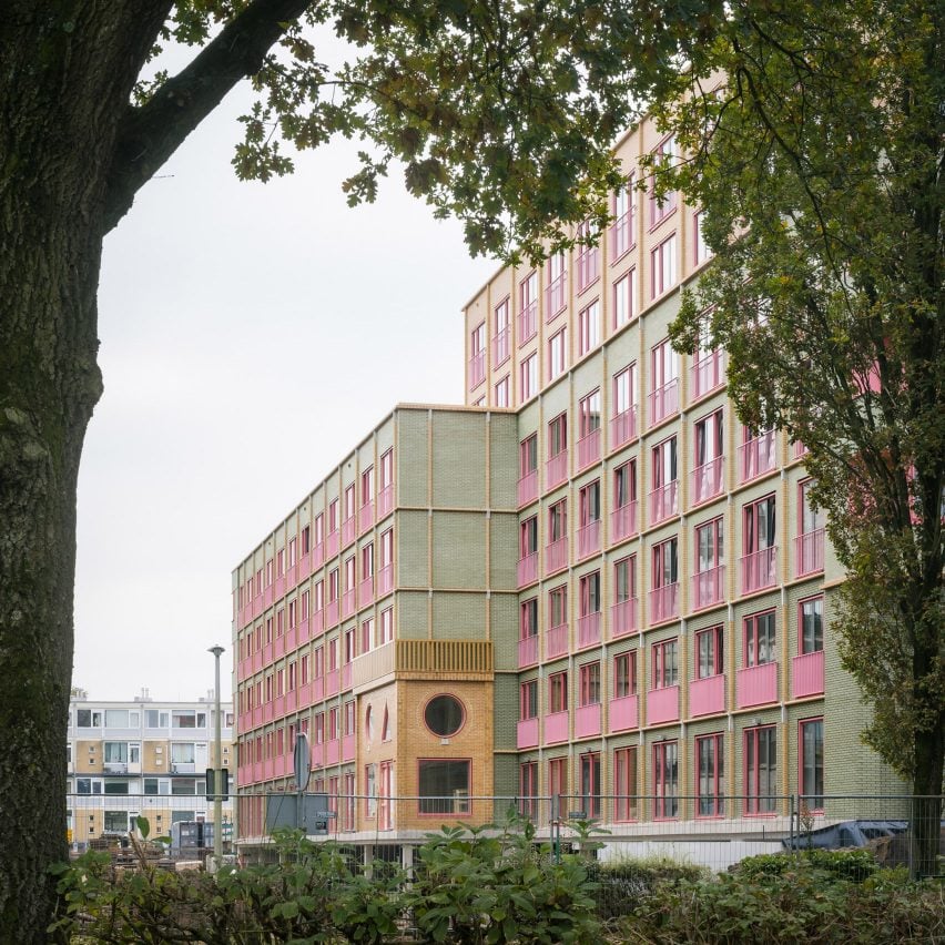 Estudio holandés Monadnock Volante ha sido completado, un Vivienda social existir Países Bajos Con colorido glaseado Edificio de ladrillo y marcos de ventana.