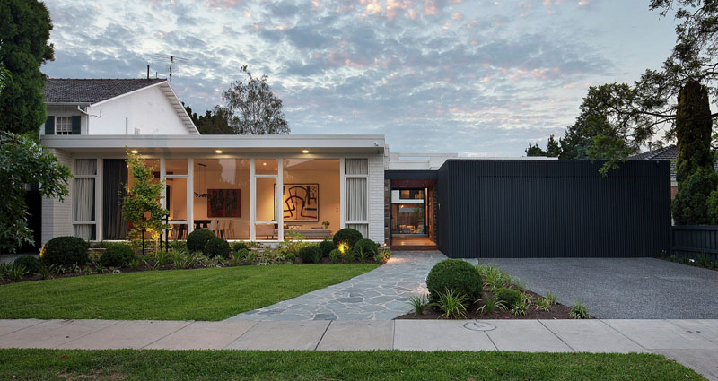 La fachada moderna de mediados de siglo oscurece la sorprendente remodelación contemporánea de esta casa