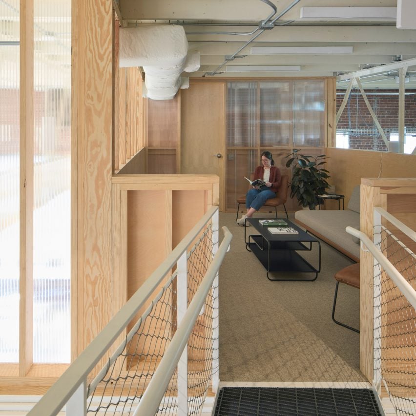 El marco de madera y el molino agregan calidez, mientras que Paneles de policarbonato Permite que las oficinas se sienten y permitan la privacidad y la iluminación difusa.