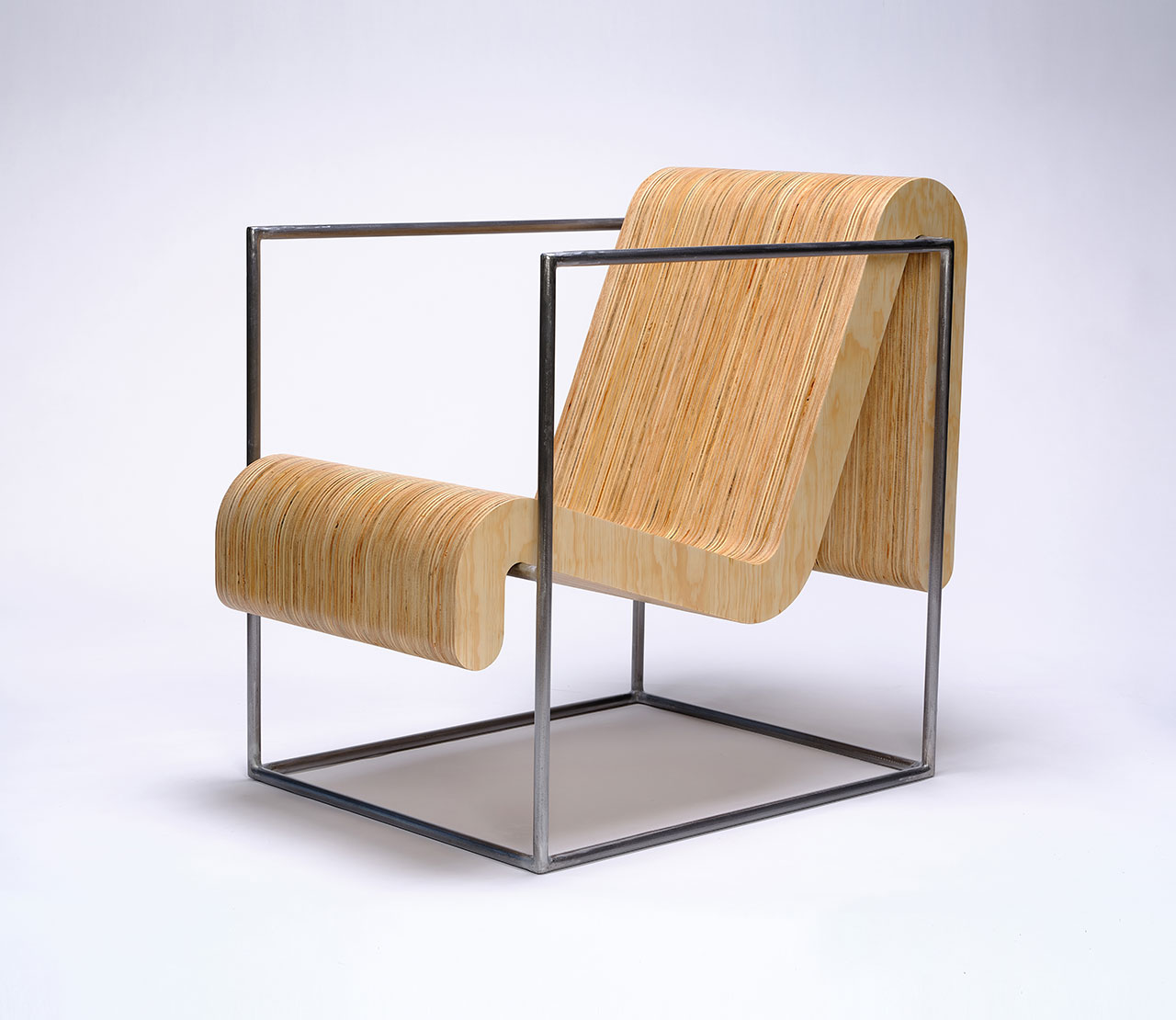 Una silla moderna con asientos y respaldos curvos de madera contrachapada está hecha de una estructura de metal simple que forma los brazos y la base, descansando contra un fondo blanco puro.