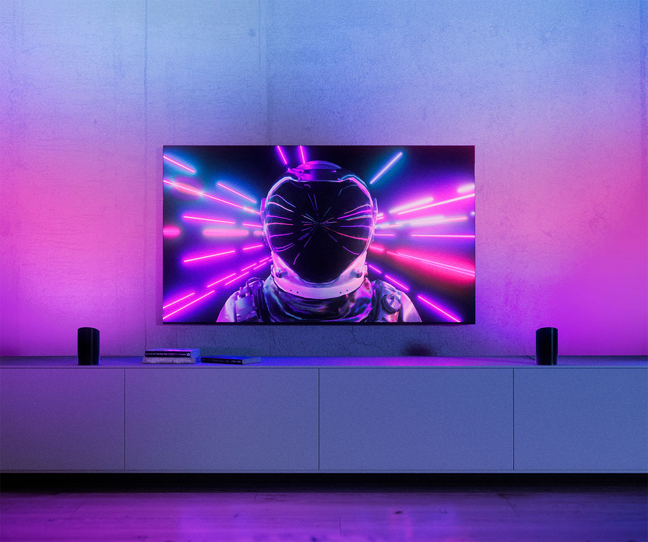 Una sala de estar moderna con un televisor en un gabinete blanco que muestra a una persona con un casco oscuro y un traje rodeado de coloridas luces de neón. La habitación está iluminada con iluminación ambiental púrpura y azul.