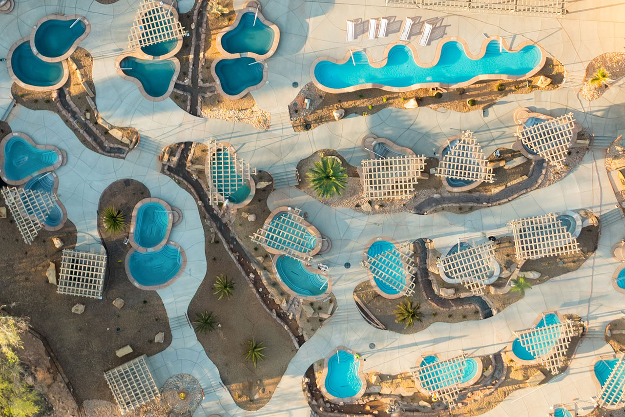 No estoy seguro de si estoy más tranquilo e interesado en la apariencia de muchas piscinas geotérmicas y minerales, o imagino lo relajados que se sentirían cuando las experimentan en persona. De cualquier manera, la propiedad parece que tiene más de 50 agua diseñada en el diseño de tallado, y puede reservar con anticipación para asegurarse de obtener su propia piscina para que nadie interrumpa su tiempo de remojo. Los cuerpos de agua azul tranquilos vienen en una variedad de formas y tamaños orgánicos, algunos con pérgolas para aquellos que desean tener un poco de sombra al sol de Utah. Recompensa: proporcionan aspectos familiares para personas con niños, solo si prefiere la paz y la tranquilidad (cada vez más), ¡adultos mayores de 21 años!