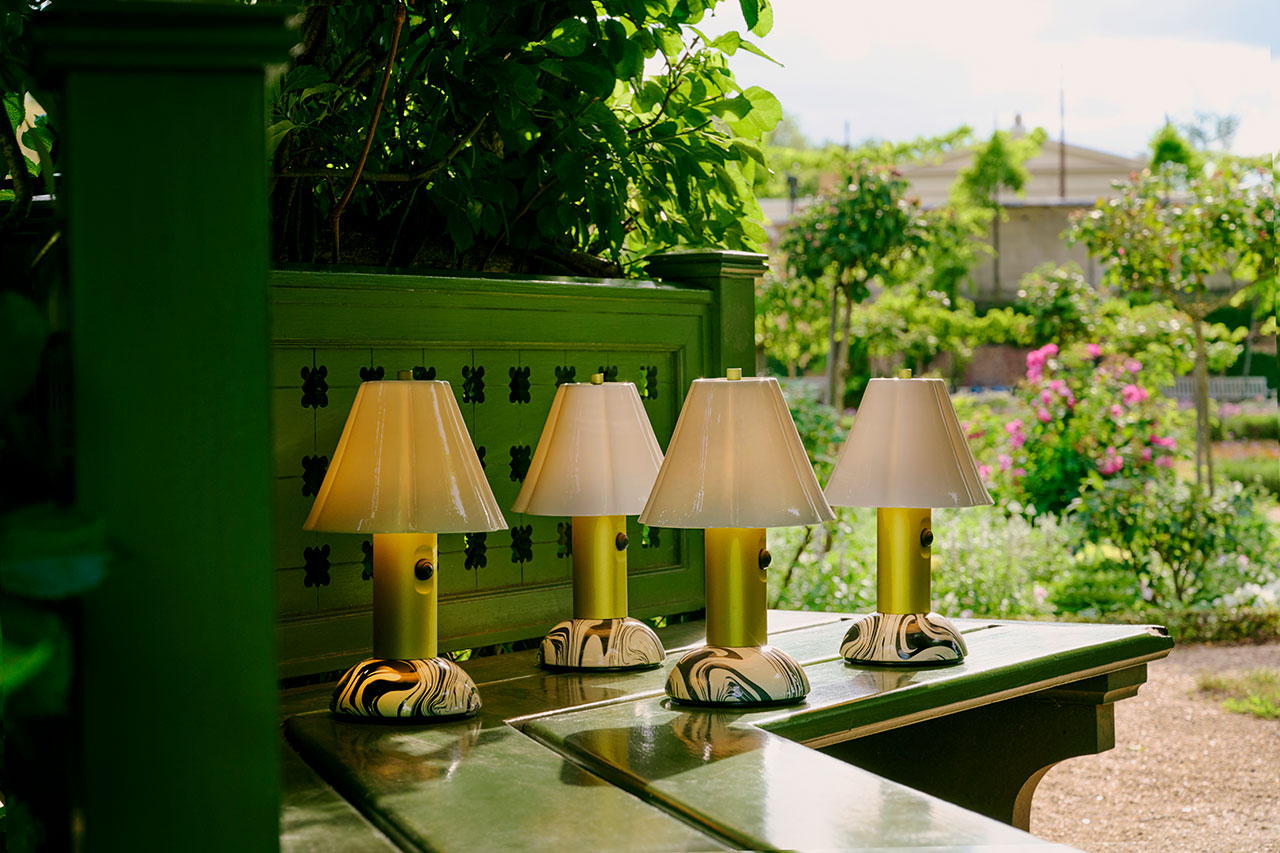 Una lámpara de escritorio con tonos blancos y una base de mármol se encuentra en un banco verde al aire libre rodeado de verde.