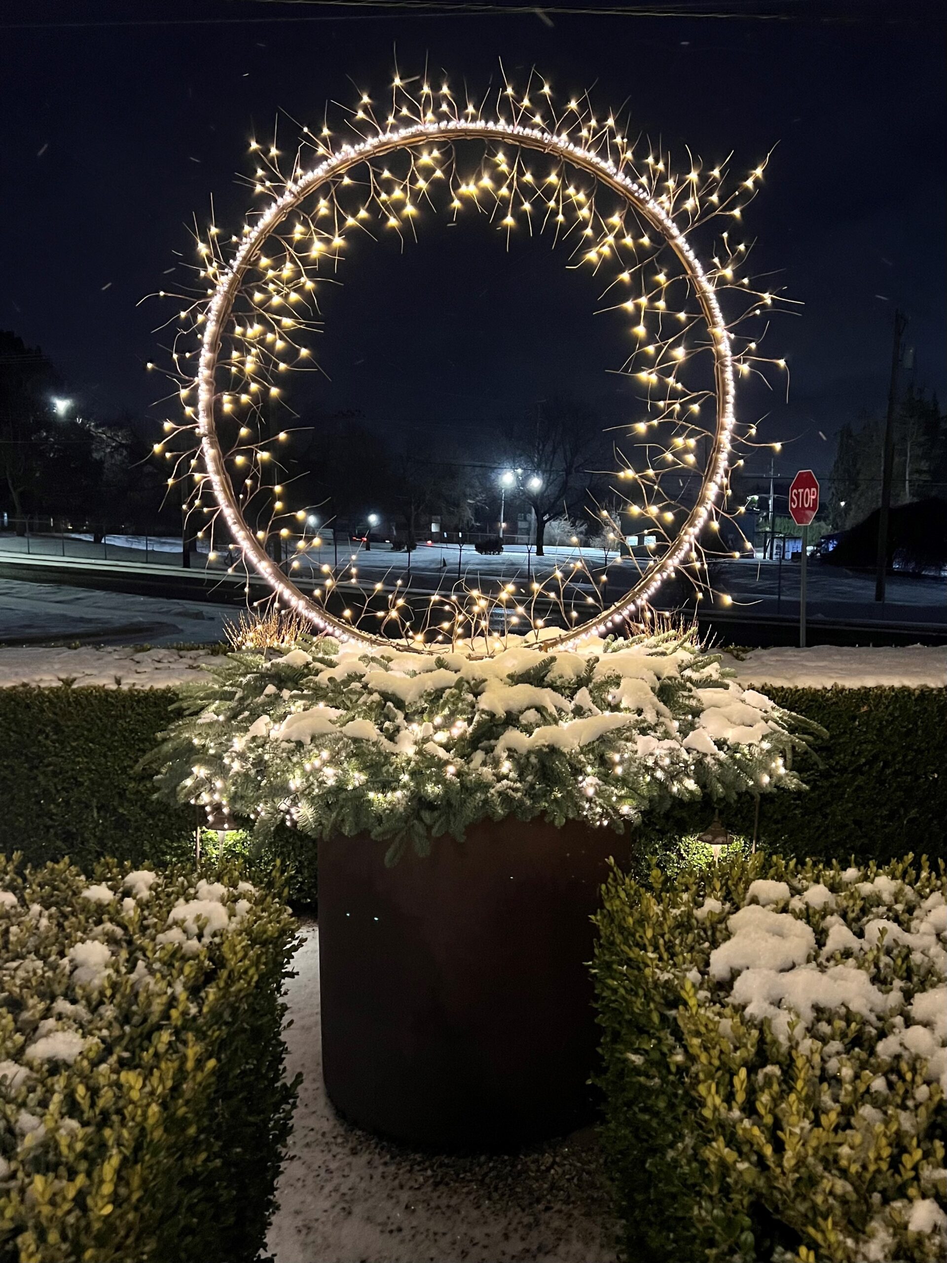 Le sigue una colección visual de halos que hemos colocado en contenedores de invierno en los últimos 15 años más o menos. La primera imagen es el último detalle. La última imagen se muestra en nuestra tienda actual. Me alegra que agregar una serie de luces de guirnaldas de rama de árboles hayan demostrado ser transformador. Continuaremos haciéndolos de una forma u otra.