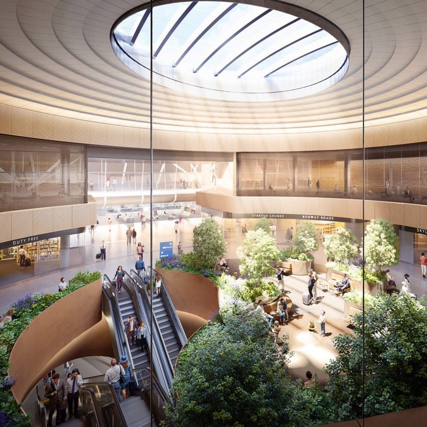 El estudio Studio Gang inauguró las obras de una nueva terminal en el Aeropuerto Internacional de Chicago O’Hare. Las representaciones iniciales del diseño mostraban un espacio con “columnas estilo huerto” y elementos estructurales curvos, inspirados en la fluidez del río Medio Oeste.
