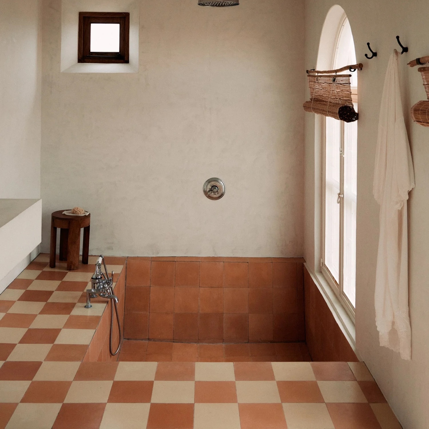 Arriba: en un hotel en la ciudad de Portugal de Algarve, una ducha combinada está hecha de baldosas mate hechas a mano. Unidad de ducha de latón desde Ronca; El que se muestra aquí es Cabeza de ducha de latón de élite. Alex Reyto Modesty House: transformación de la casa familiar en retiro rural en Algarve, Portugal.