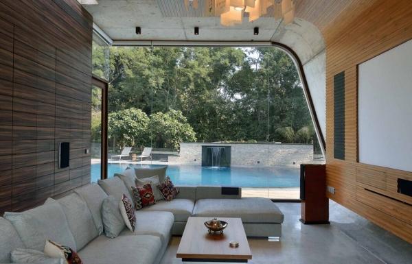En todo el pabellón de la piscina, están dentro de los pisos de concreto pulido, que muestran los acabados originales de la meteorización natural. La unidad de medios flotantes enmascara el dispositivo AV, reflejado por un panel curvo que define el asiento y el área de la barra.