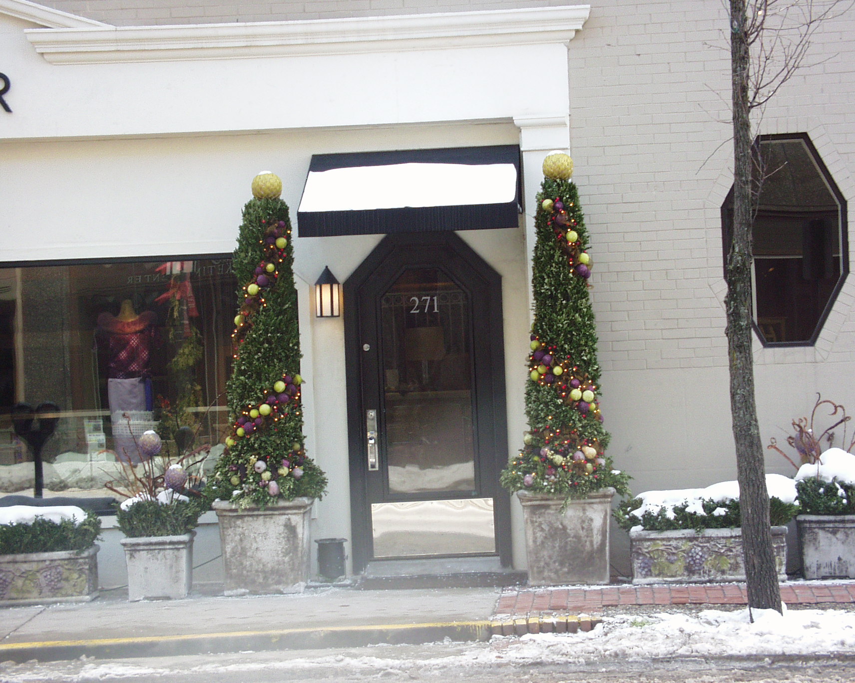 En 2001, reciclamos las peras muertas de Bradford de los proveedores de guardería y los limpiamos con cera de cobre. Los árboles están decorados con almohadas de hilo y bolas de terciopelo de platino.