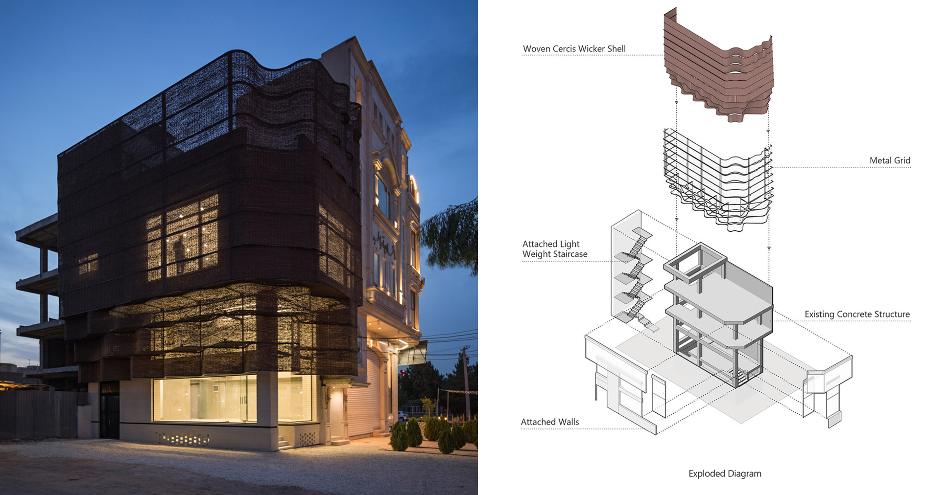 Al diseñar fachadas, los arquitectos tienen dos tipos: aquellos que los desarrollan con otros espacios y aquellos que priorizan la fachada en sí, dando forma a balizas urbanas. Para el proyecto comercial de Arghavan (Ceccis) en Yazd, Irán, la fachada celebra las tradiciones y artesanías locales en la región, especialmente el uso del tejido de mimbre y las ramas abandonadas de los árboles de Cercis para crear una nueva tecnología de edificios que se puede aplicar a otros diseños más adelante.