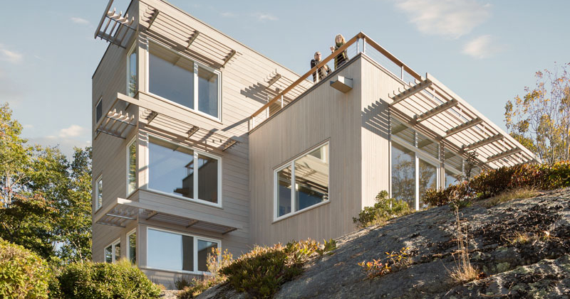 La casa de Biddeford habita en la costa de Maine, un estudio de poder tranquilo y belleza natural. Se sienta sobre una perilla de granito a 30 pies sobre el estanque del lirio, capturando el espacioso océano Atlántico mientras abraza los alrededores escarpados.