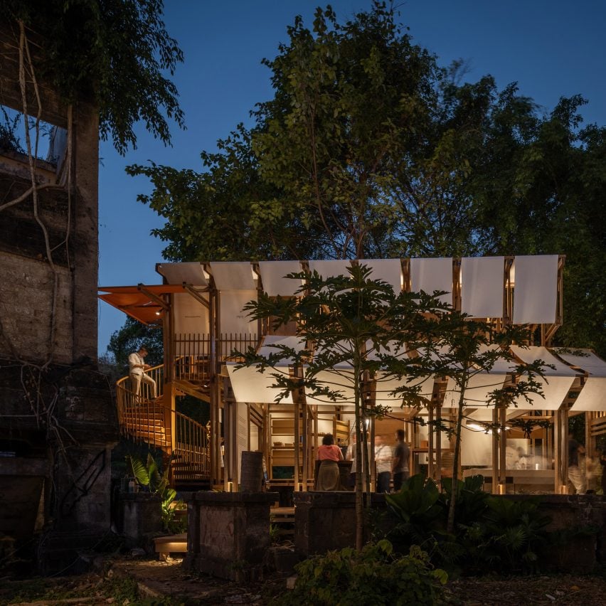 Jia planeó el salón colectivo refleja este espíritu. Diseñado por Yakarta con sede en Visita el estudioel pabellón Serumpun modular de tres capas está construido a partir de madera de origen local.