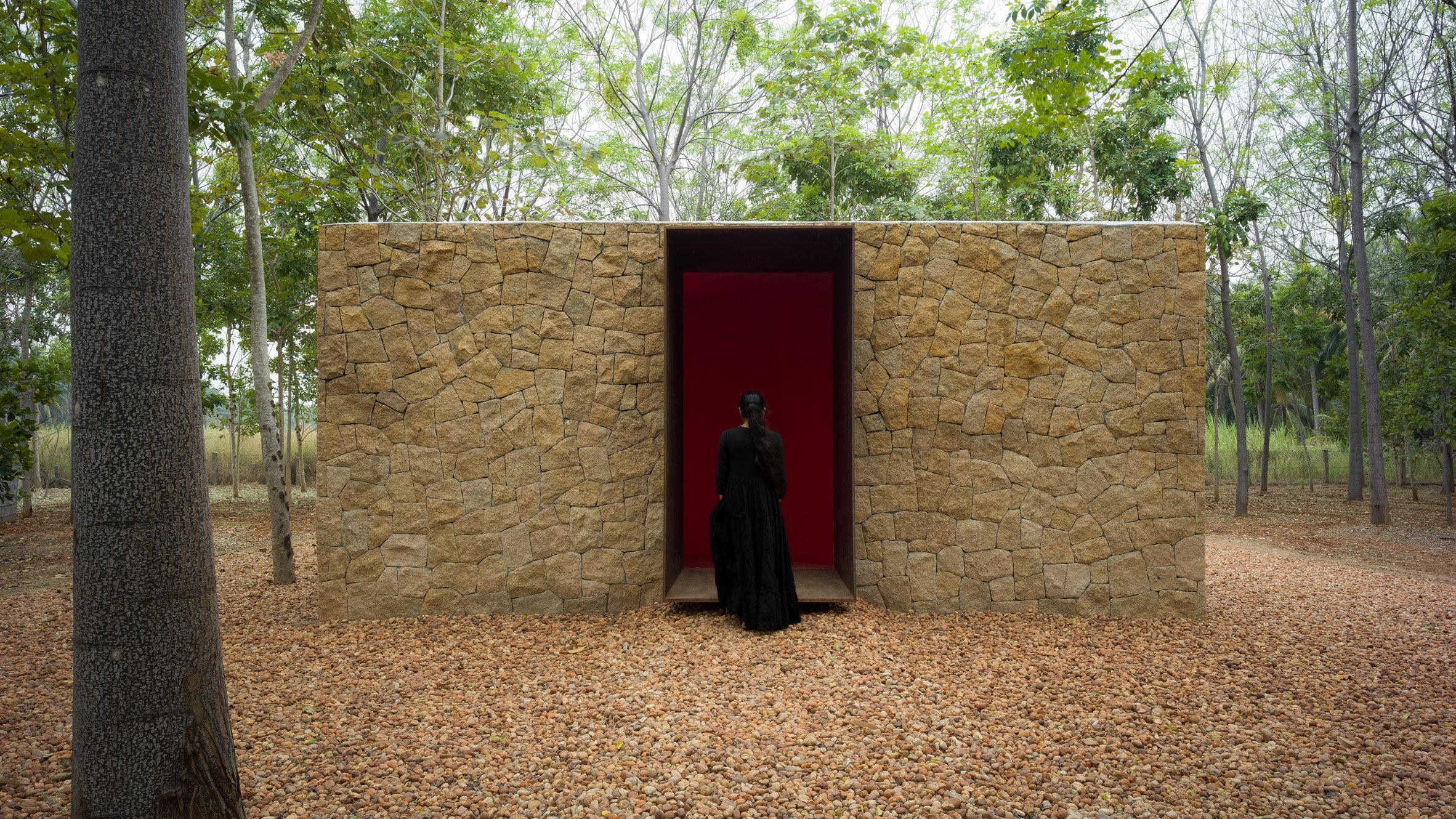 El diseño de la práctica arquitectónica 182 ha completado el santuario de los árboles, una piedra memorial espacio Tamil naduIndia, esto se alineó profundamente Hormigón rojo Simboliza el corazón humano.