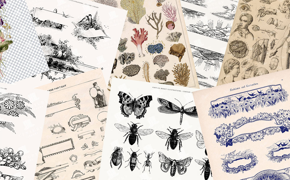 de Biblioteca del siglo. solo $ 1puede acceder a todas las ilustraciones, patrones y archivos de textura sin límite para inyectar gráficos vintage auténticos en sus diseños y obras de arte.