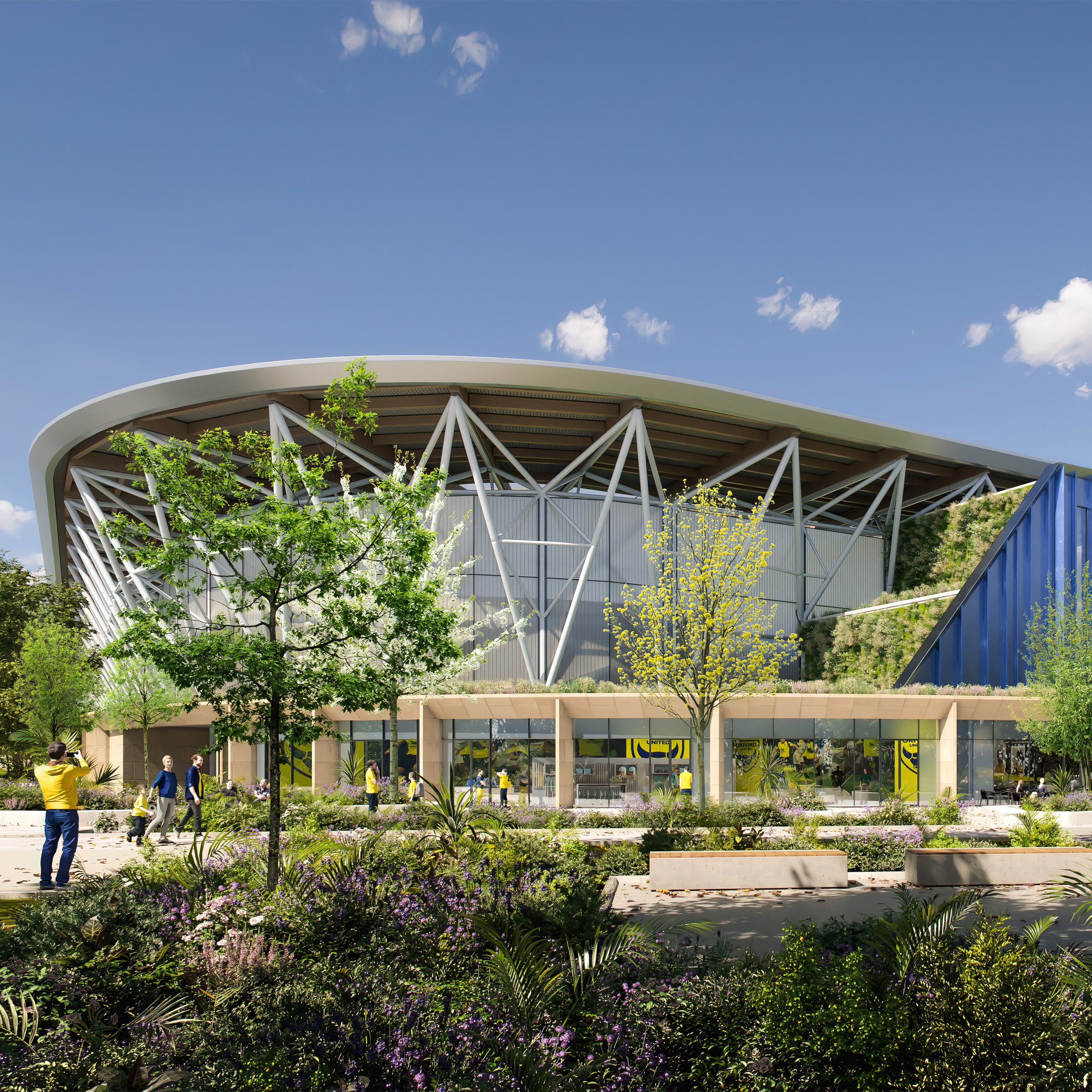 El renderizador revela un estadio con su techo inclinado suavemente inclinado con esquinas curvas que cubren los paneles azules. Techo verde Cubra con una sola capa de volumen de vidrio, luego Muro verde Hay otras áreas de plantación disponibles.