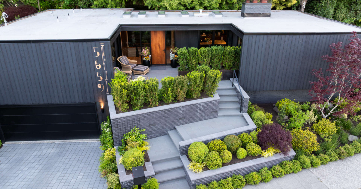 Un detalle pequeño pero llamativo se encuentra justo en la entrada de esta casa moderna renovada de mediados de siglo, donde los números de casa a medida lo muelen directamente al revestimiento