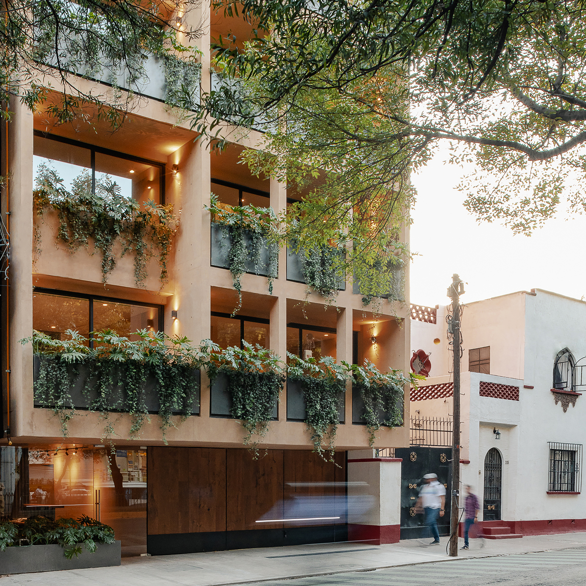 Descripción enviada por el equipo del proyecto. El Nuevo León 207 se origina en el juego de trazas y columnas estructurales, que crean fachadas, una malla con vegetación que crea una relación dinámica entre el interior y el exterior. Ubicado en la comunidad de hipódromo, Ciudad de MéxicoEl proyecto integra vegetación a lo largo de toda la fachada en el fondo, lo que permite que el edificio se construya en árboles cercanos y proporcione oxígeno limpio a la ciudad. El primer piso se retrae para expandir la acera y facilita la coexistencia entre peatones y carreteras.
