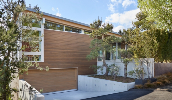 El exterior de la casa moderna de Mercer Island presenta un cálido revestimiento horizontal de cedro, combinado con ventanas enmarcadas blancas transparentes para crear una fachada limpia pero atractiva. La sensación «zen» de la casa continúa siendo plantada afuera en un estilo japonés.