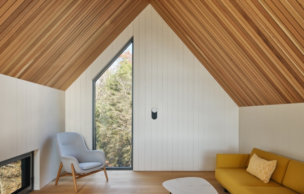 Un cómodo área de trabajo loft optimiza para interiores compactos, que proporciona escenas de bosque y lago enmarcados en la parte delantera y trasera.