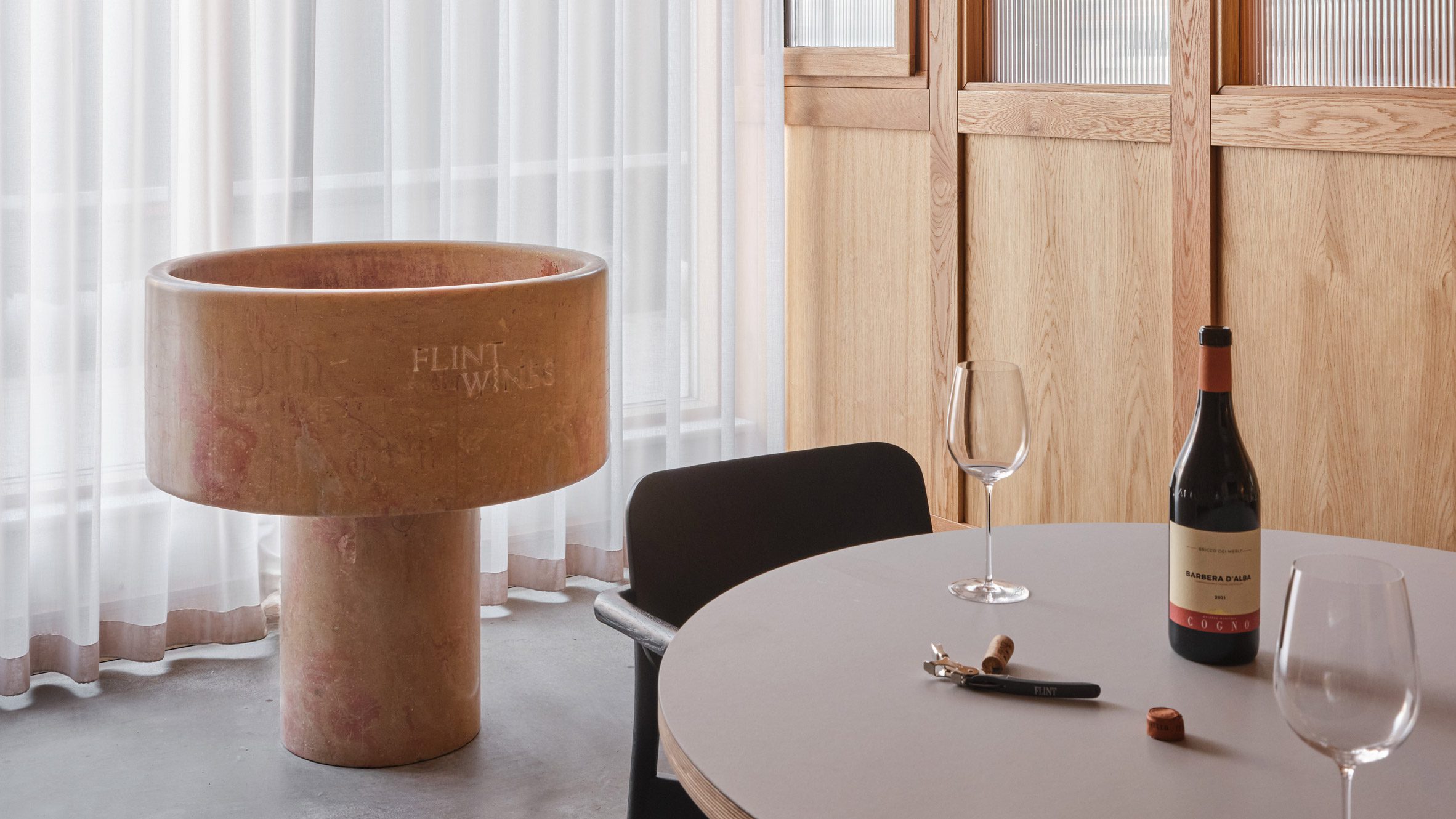El vidrio del piso al techo está escondido detrás de las cortinas lilas translúcidas, colgando de un gran frente independiente mármol Spittoon: una salida para vinos no deseados escupiendo durante la degustación.
