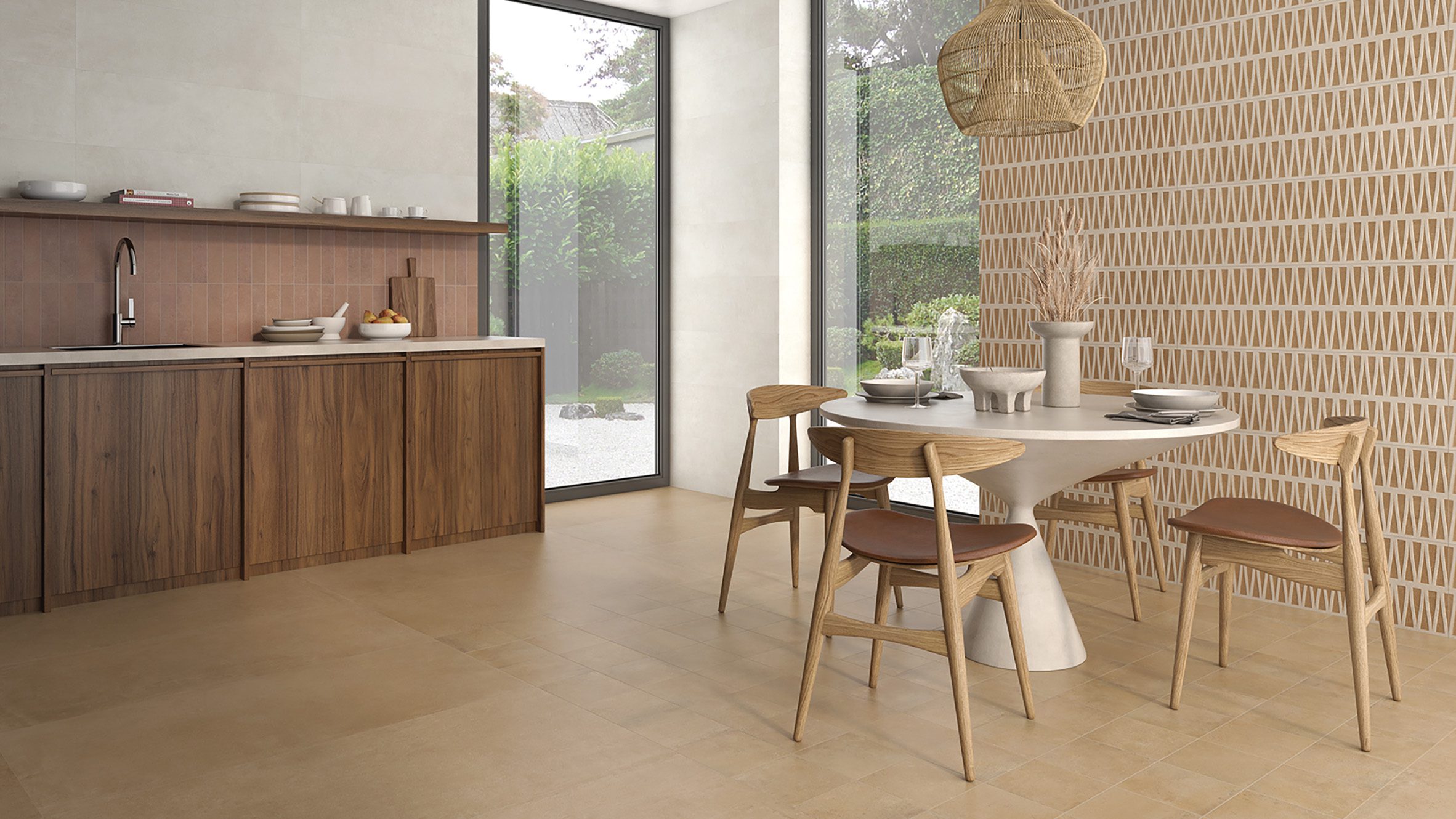 La gama de terracota viene en una variedad de tamaños, incluidas losas de 600 x 1200 mm para el piso. El diseño de color sólido del mosaico de pared varía de 60 x 250 mm a 300 x 900 mm.