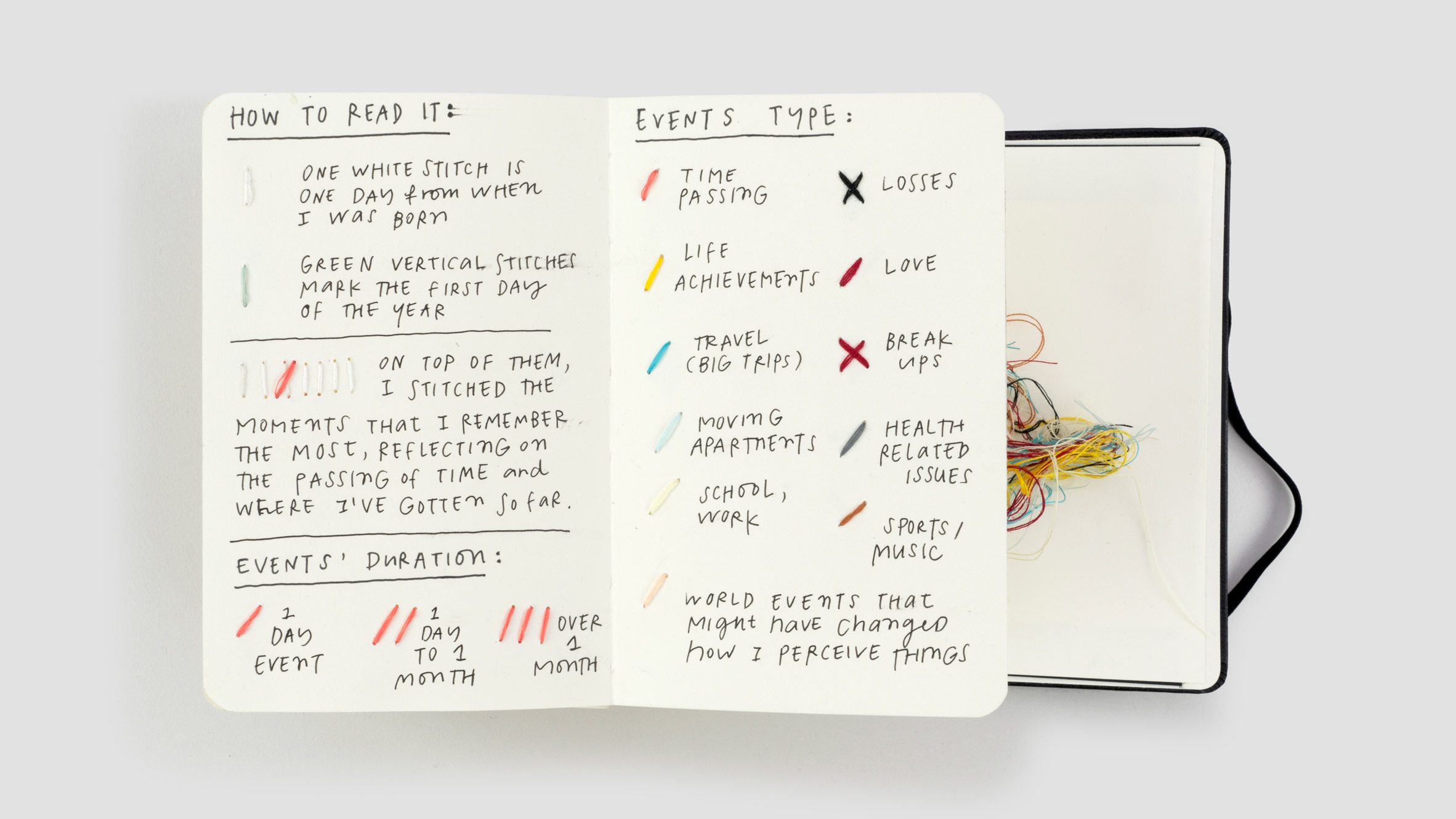 «Un libro de artistas creado para la serie Moleskine Foundation, donde grabé mi vida con bordados basados ​​en datos. Cada puntada representa un día de mi vida, y los colores representan eventos importantes, tejiendo una narración tangible de la historia personal».