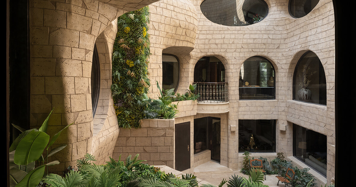 Fonte d’Amore Courtyard Nueva Delhi Al manifestarse como un edificio fluido (M: OFA), es una transformación de 645 pies cuadrados que convierte el atrio interior descuidado en el núcleo escultórico de la casa. Diseño dirigido por el arquitecto líder Manish Gulati piedra Space combina la artesanía y la tecnología con un gesto arquitectónico personal profundo.