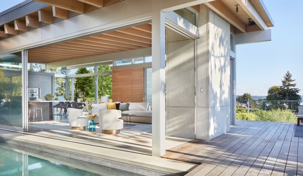 Mercer Island Modern es un retiro urbano inspirado en zen con vistas al lago Washington. Terminado en 2019, el hogar gira en torno a las características del agua y combina el minimalismo japonés con materiales naturales para un refugio pacífico para la vida.