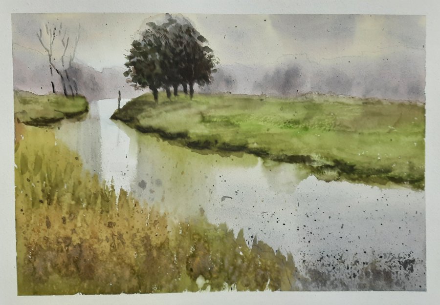 Si no recuerdo mal, esto se dibujó durante la pandemia, cuando yo y muchos otros en Chennai e India estuvimos confinados a nuestra casa durante mucho tiempo. Durante este tiempo, vi un video de demostración de Kangan Das, un famoso pintor de acuarela indio, y lo dibujé una y otra vez. Esta es una acuarela de tamaño A3 en 270 GSM Chitrapat Watercolor Paper (Rough).