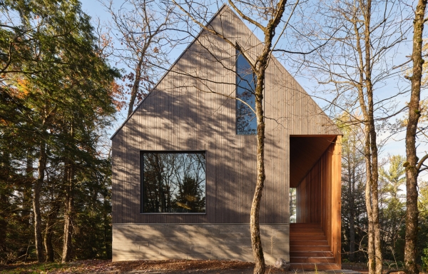 La espaciosa vista del lago del marco de elevación de vidrio de la casa se contrasta con el lado opaco orientado al bosque y enfatiza su estrecha conexión con el agua.
