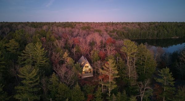 Terminado en 2022, Bunkie on the Hill reinterpreta la cabina clásica con volumen de azotes dividido, vistas enmarcadas y artesanía sostenible.
