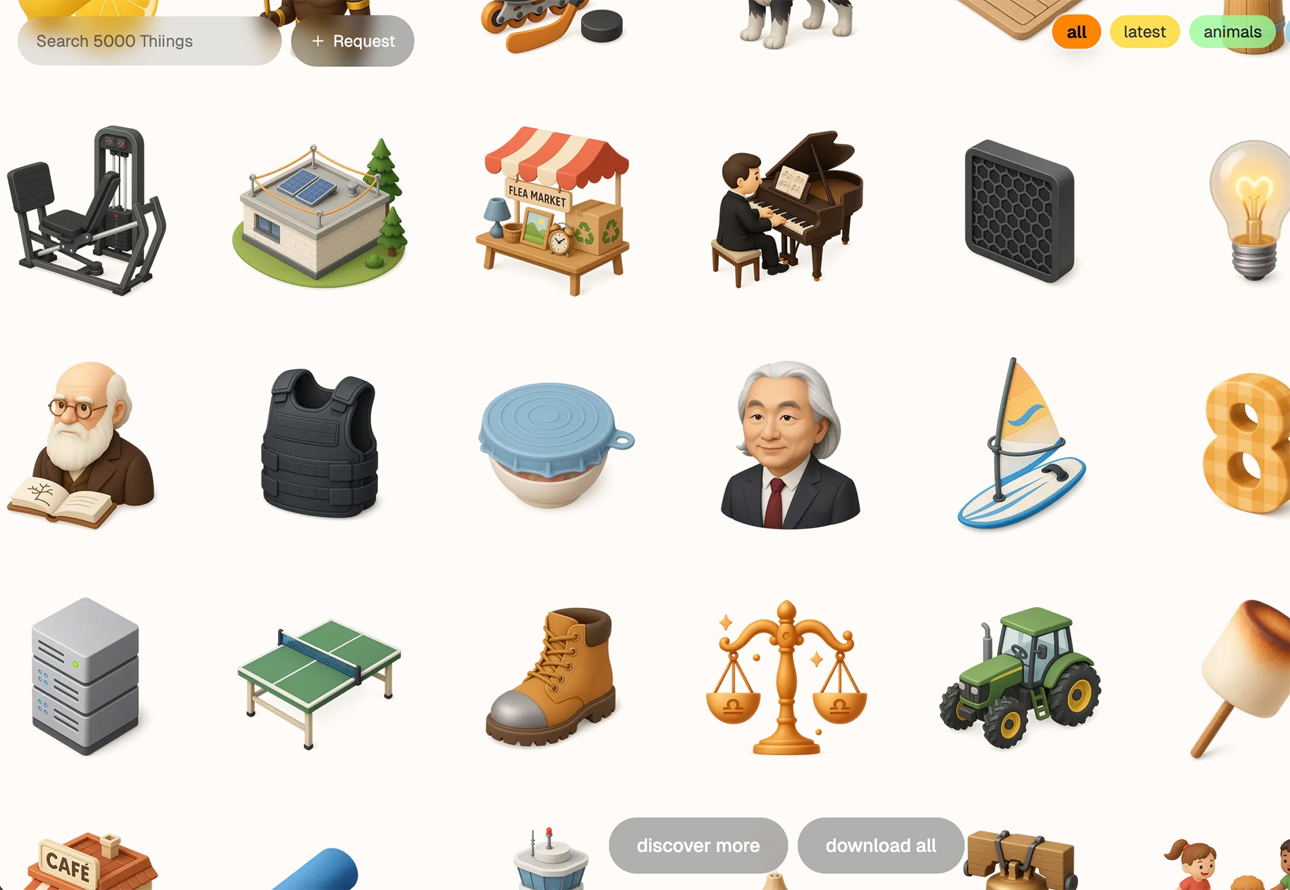 Things es una colección de más de 1.900 iconos 3D generados por IA gratuitos. Explore por tema, genere el suyo o descargue la colección completa. Todos los íconos están disponibles de forma gratuita en proyectos personales o comerciales.