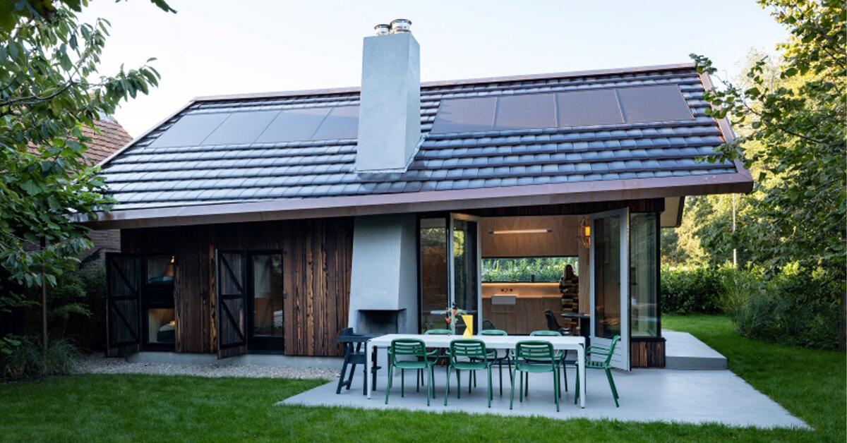existir Isla Holanda O Terscheling, V Building en V Summer Home, ha completado el edificio de Summer, Prefabricado Mantener sitios web personalizados y específicos y roles específicos para casas de vacaciones. Aunque está construido en un sitio estandarizado Marco de maderaSe transporta solo en tres camiones y se reúne en el sitio en tres días casa Utilizando su techo asimétrico travieso, las combinaciones de estructuras prefabricadas y sostenibles con casas que están estrechamente relacionadas con su entorno. ocho Paneles solares,y Productos de cerámica Las baldosas del techo se integran cuidadosamente en el techo, proporcionando al hogar una etiqueta de energía A ++.