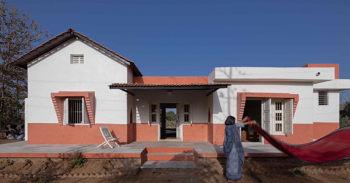 La casa está ubicada en un pequeño pueblo en Gujarat y consta de tres módulos separados, cada uno de aproximadamente 40 m2, que reflejan diferentes métodos y usos de construcción. Un módulo con azulejos inclinados techo y nivel interno, otro con refuerzo plano Específico Tableta, la tercera contiene una bambú– Tableros agregados al área de servicio. Juntos, estos módulos se adaptan a los patrones cambiantes en la vida familiar rural, incluidas las unidades familiares más pequeñas, los residentes mayores y las prácticas comunes de construcción progresiva con el tiempo. El costo total sigue siendo relativamente bajo, con el precio de construcción de aproximadamente Rs 7 lakh (aproximadamente US $ 8,300) por módulo, lo que permite la flexibilidad financiera y la expansión futura.