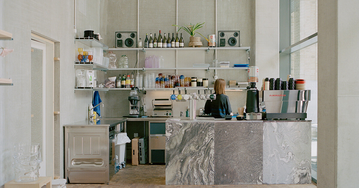 Desde el exterior, la marca del edificio está texturizada ladrillo frente También tiene una gran abertura de vidrio para las vistas del café. Metal Heces y mesas. en, Específico Muro, un bar Venas transgrotantes piedraLos estantes abiertos están llenos de botellas y equipos, estableciendo un tono tranquilo y utilitario. La paleta de panel plegable resalta la textura del material y enfatiza la selección cuidadosa de los objetos en uso.