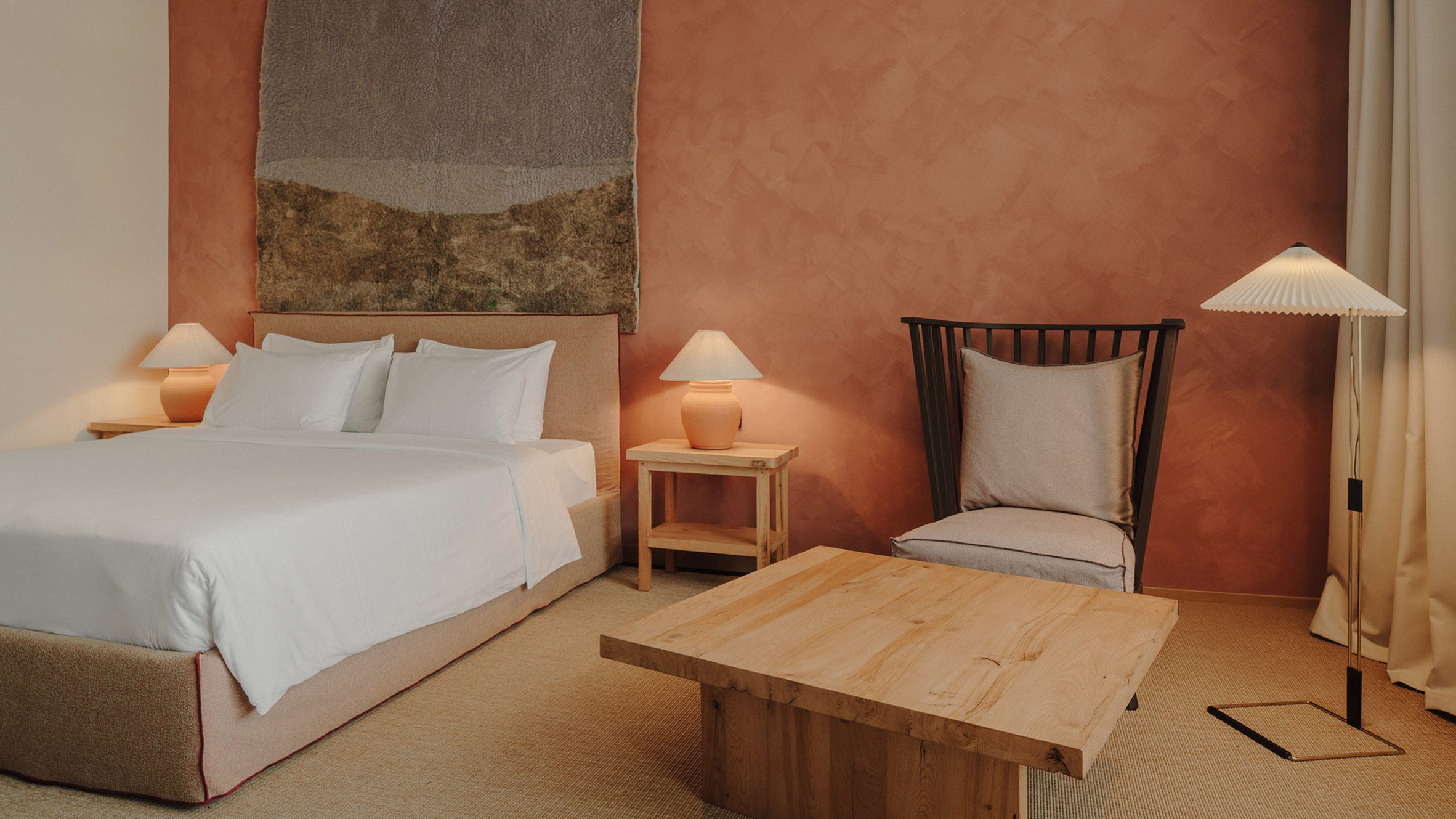 El dormitorio cuenta con artistas georgianos Mariana Chkonia Esto agrega detalles táctiles y orgánicos, mientras que la alfombra de yute tejida a mano está en capas en la parte superior del piso de madera.
