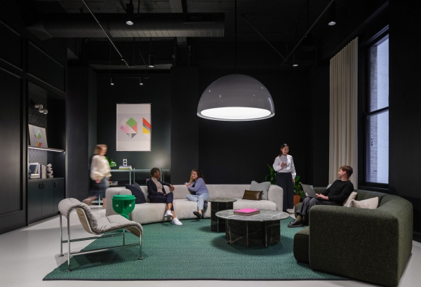 El «Hotel» es una relajante sala de salón con poca luz adyacente al área de trabajo abierta diseñada para reuniones informales y conversaciones espontáneas.
