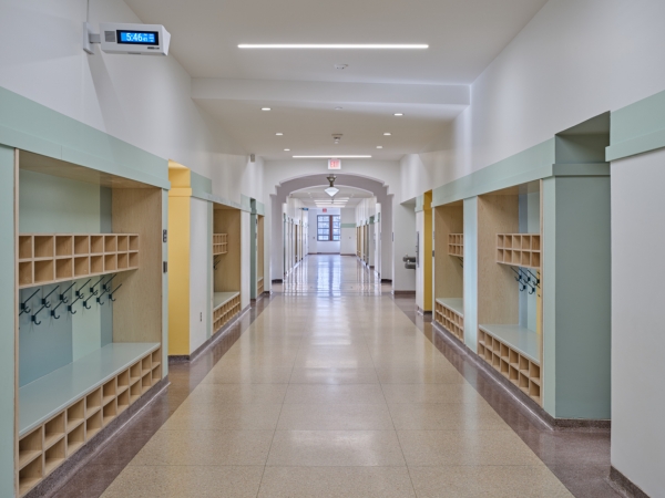 Los proyectos de reutilización adaptativos completos respiran nuevas luz, color y flexibilidad hacia los corredores rígidos y las aulas de la escuela secundaria. Las paredes inclinadas de madera contrachapada crean ángulos de reunión íntimos que fluyen a la perfección en la estructura histórica.