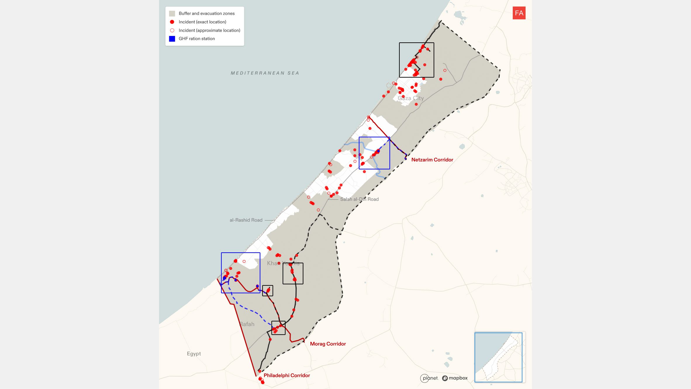 Arquitectura forense A partir del 18 de marzo de 2025, el alto el fuego de Israel con Hamas, y el 1 de agosto, utilizando análisis espacial e investigación de código abierto para crear métodos de asignación y ataque de ayuda en la infraestructura de ayuda Mapa anotado de Gaza Y un informe de texto, obtenido de Fundación Mundial de la Paz.