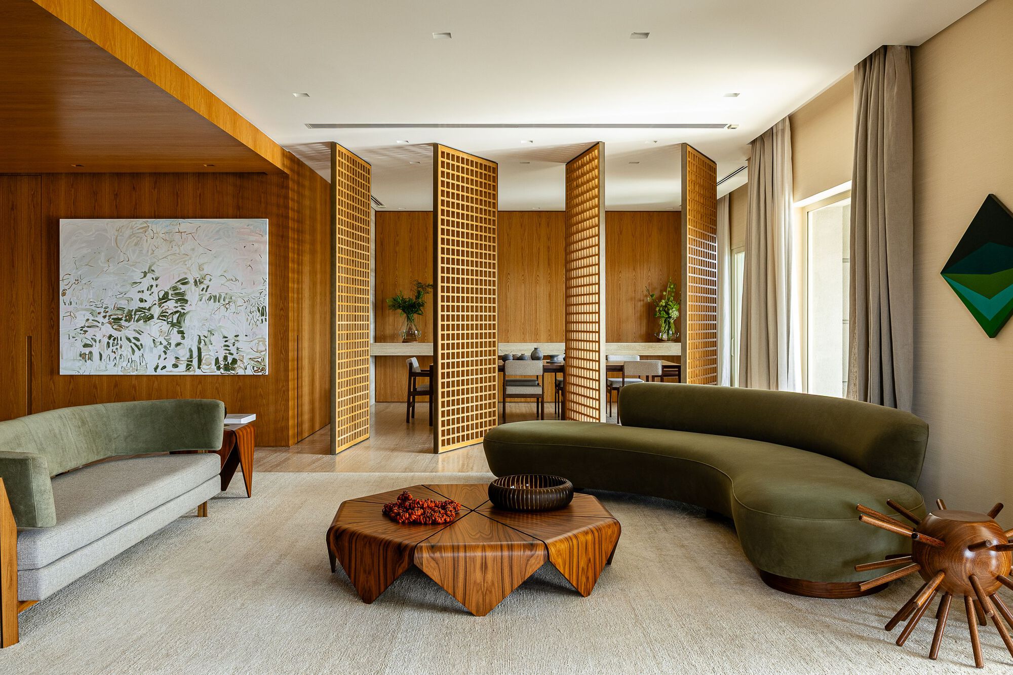 este Debido al centro de tablones, es posible la flexibilidad Eso expresa espacio con elegancia y fluidez. Cuando están cerrados, definen el rango visual y crean una atmósfera más íntima. Cuando están abiertos, eliminan las barreras espaciales y expanden las percepciones del medio ambiente, proporcionando una sensación de continuidad y apertura.