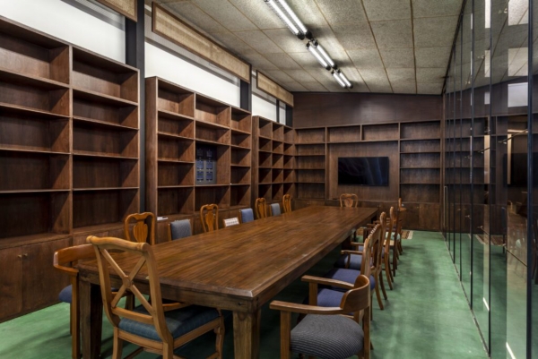 El principal espacio de reuniones en la sala pública cuenta con una larga mesa de madera y una pared de almacenamiento enmarcada por iluminación formal.
